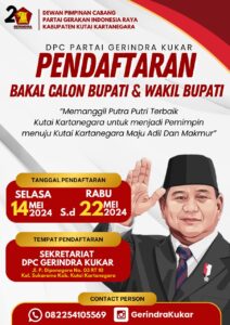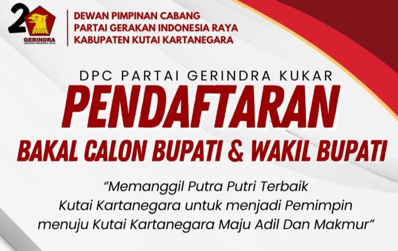 Infonusa.co, Kutai Kartanegara – Dewan Pimpinan Cabang (DPC) Gerakan Indonesia Raya (Gerindra) Kabupaten Kutai Kartanegara (Kukar) secara resmi membuka pendaftaran bagi para tokoh yang berminat maju sebagai Bakal Calon Bupati (Cabub) dan Wakil Bupati (Cawabub) Kukar periode 2025-2029.